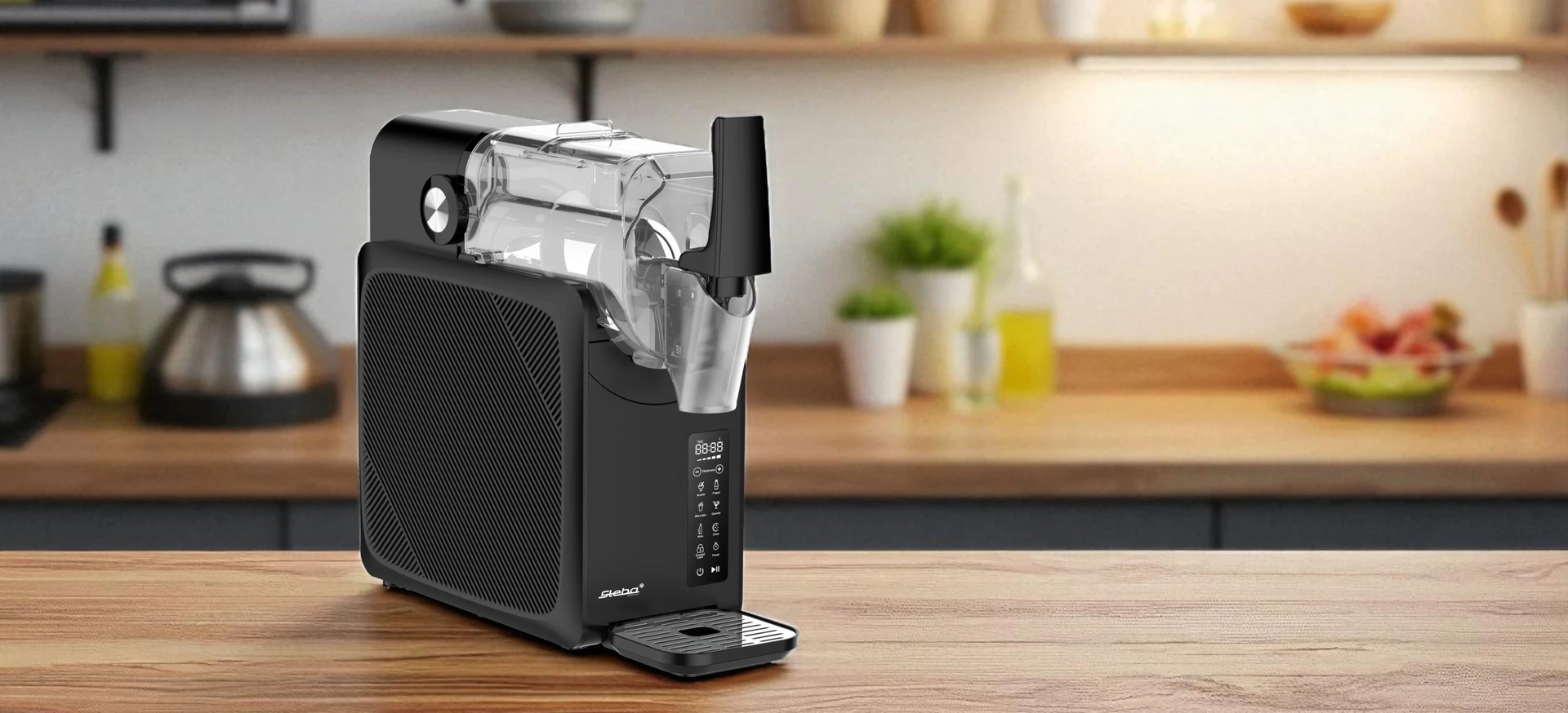 LED displej s dotykovým ovládáním zajišťuje intuitivní a přehledné ovládání, zatímco časovač s nastavením až 24 hodin nabízí maximální flexibilitu. Po vychutnání nápoje se o práci postará automatický čisticí program – a díky snadné demontáži je i ruční čištění obzvláště jednoduché.
